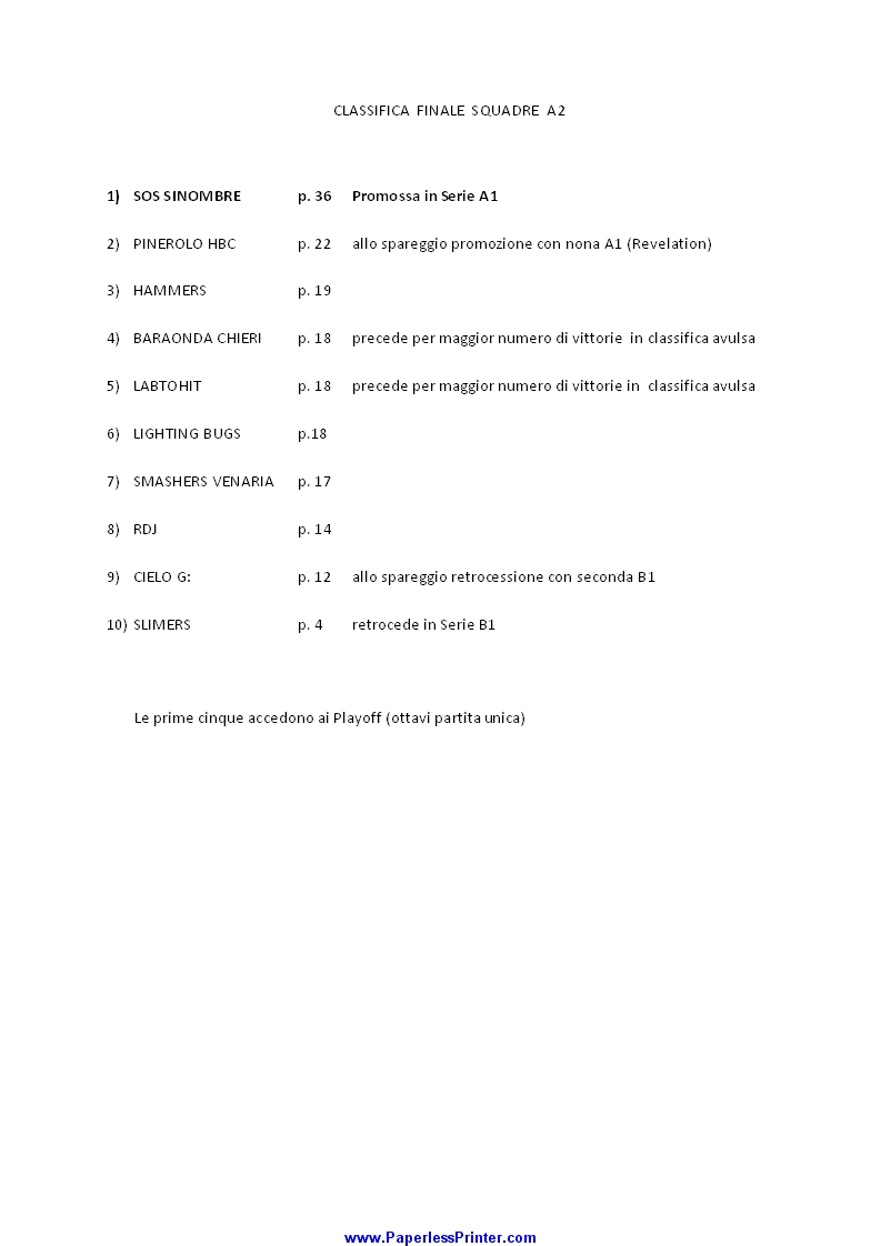 CLASSIFICA B2 DOPO REGULAR SEASON